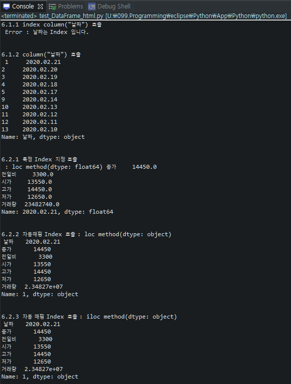 print("6.2.1 특정 Index 지정 호출\n : loc method(dtype: float64)", dfs.loc["2020.02.21"], "\n\n")