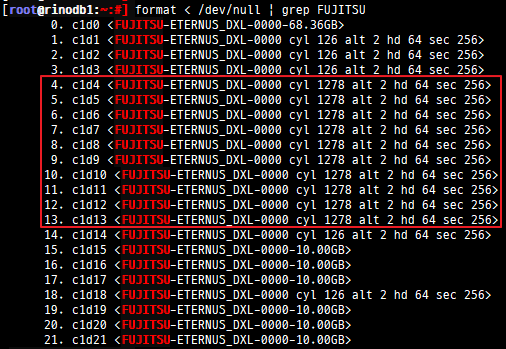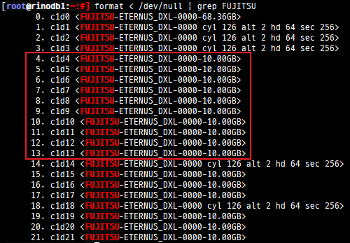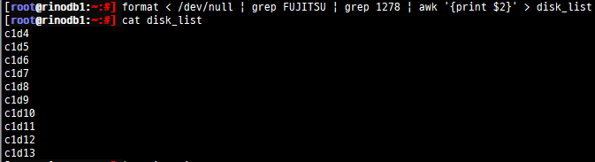 [root@rinodb1:~:#] format < /dev/null | grep FUJITSU | grep 1278 | awk '{print $2}' > disk_list